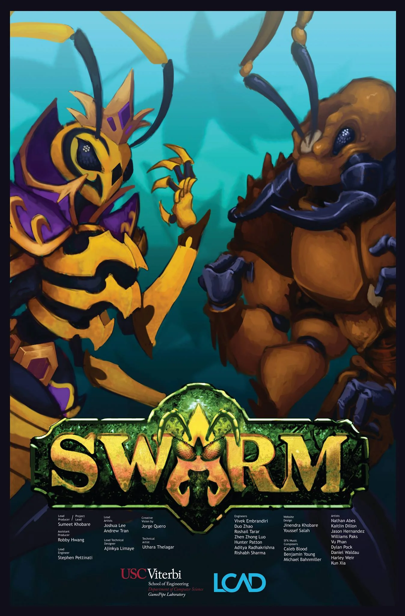 Swarm is an upcoming bug-themed MOBA where the common central mechanic of pointing and clicking with a mouse is replaced with real-time fighting mechanics via hand-held controls (Xbox controller). Swarm combines the strategy of a MOBA with the high-speed decision-making of a fighter game. Swarm is being developed for PC using Unreal Engine 4.9. I am the Lead Engineer on Swarm; my responsibilities include: creating a pipeline to ensure that each deadline is met, assigning engineering tasks each week (10+ programmers), using Perforce for source control (maintaining the master branch and merging all engineers code each week), and using C++ and blueprints in Unreal Engine 4.